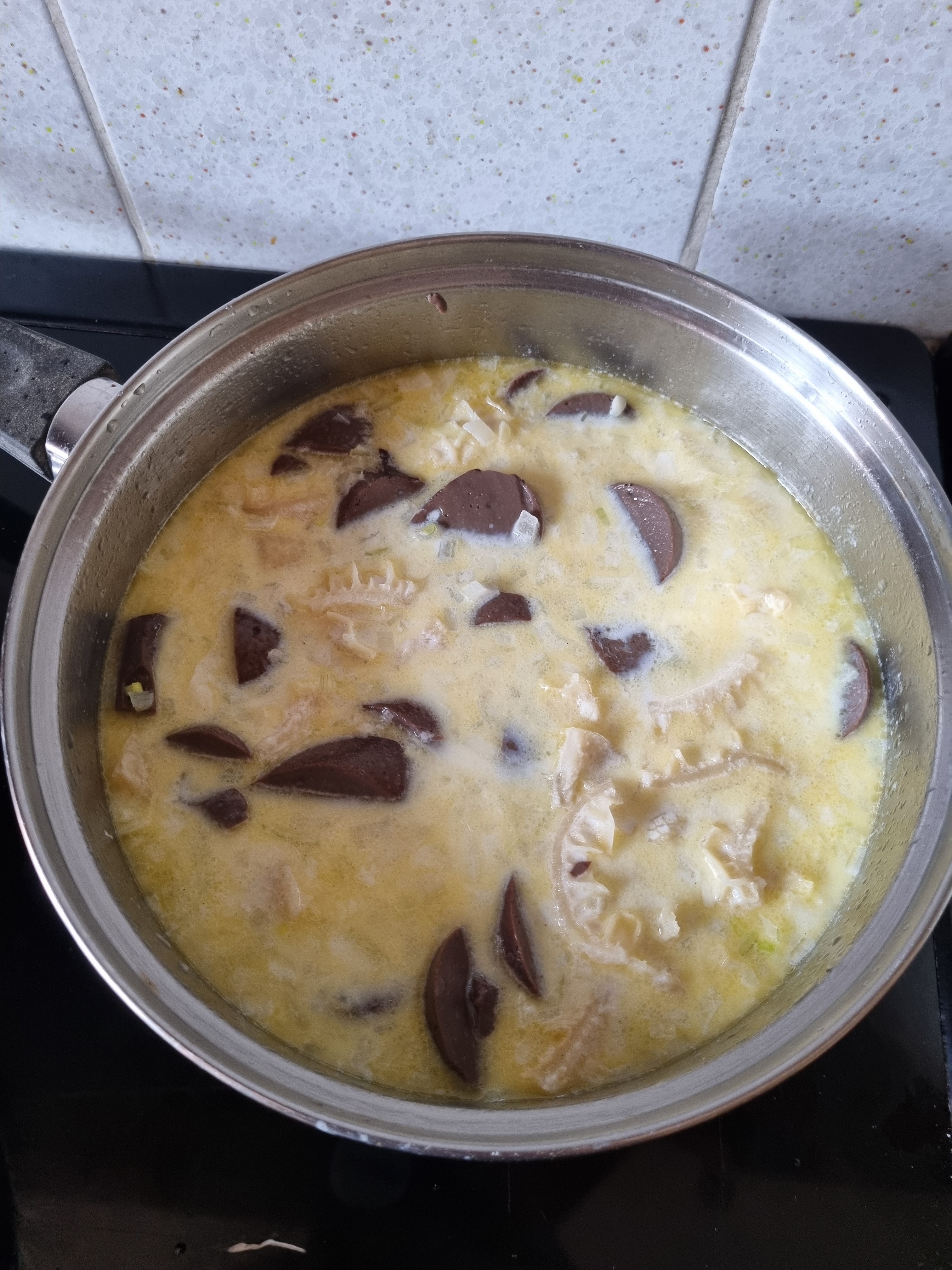 Thickening: Mix 1 tablespoon of corn flour / corn starch / thickening, with a tablespoon of milk in a cup and make a cornflower slurry. Add to Tripe and milk pot, and bring back to heat. Add strained Packet (Drisheen). Thicken further if required.