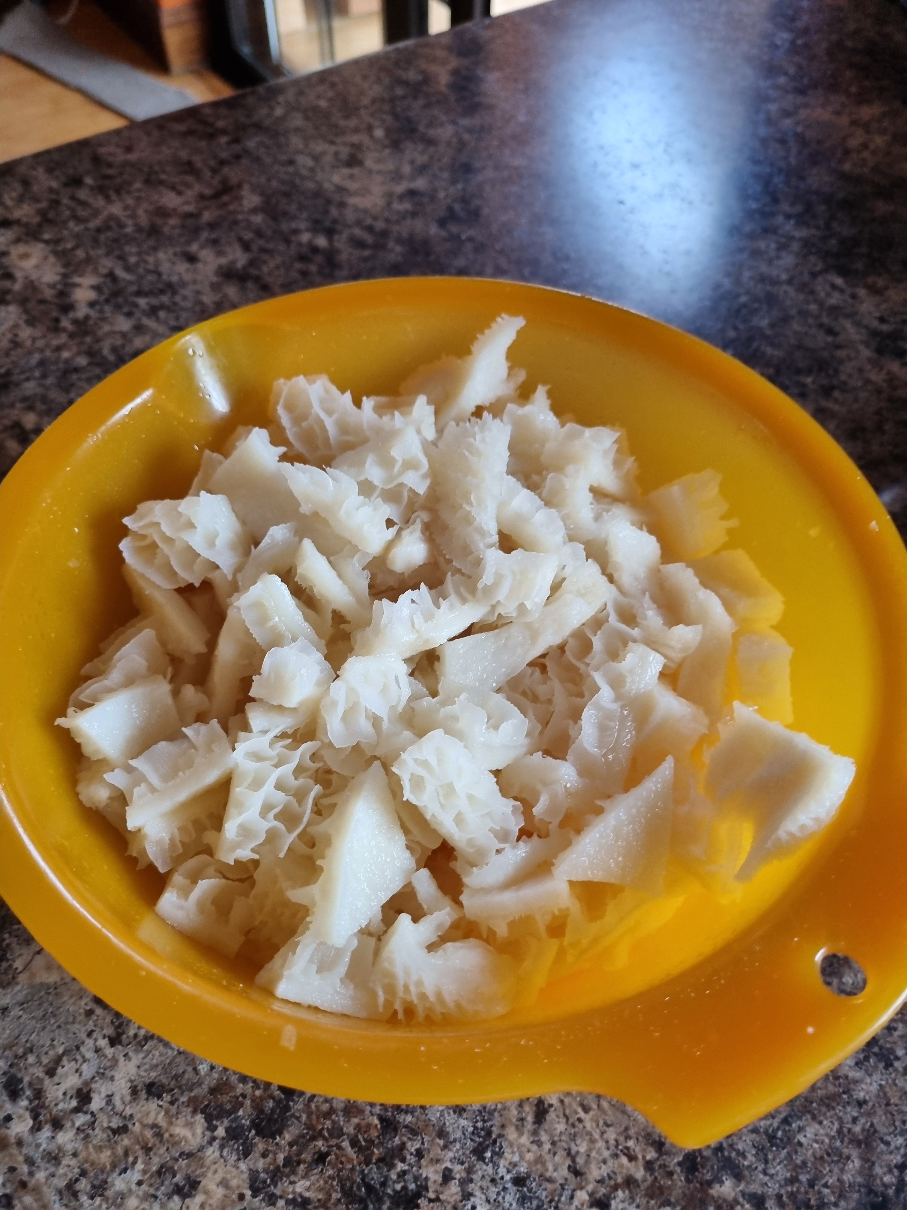 Chop a large yellow onion and add to a separate pot, add 3/4 Ltr. of milk, add butter and seasoning. Bring to simmer and add strained tripe and only then add salt to taste.
