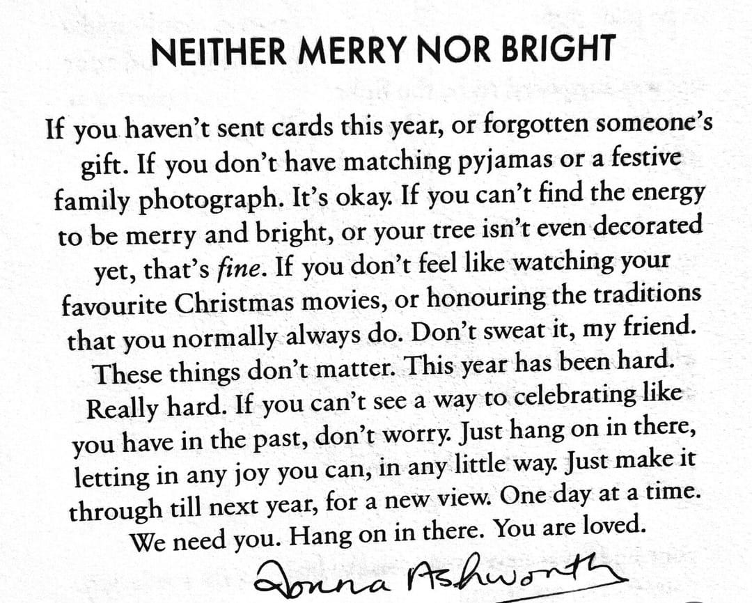 To compound things this year, I’ve lost a long held phone in a Pollock Hole accident and a corrupted Laptop which I am very happy to report, have been happily replaced and repaired respectively but I’ve made more than my fair share of mistakes in restoring contacts. A very Happy Christmas to anyone who’s Christmas feels a bit different this year, I think sometimes we use Christmas as a checkpoint, each time it comes around, we see all of the things that have changed in the last year. We are flooded with the feeling of familiarity that comes with Christmas lights and pine scented candles or potpourri. But we are also met the the incredible awareness that everything has changed since the last time we decorated a Christmas tree. Maybe you’ve seen some heartbreak this year. Maybe you’ve experienced some loss, maybe you’ve done some healing. And maybe you’re still working on it. But no matter what you’ve grown, and you should really be proud of yourself for all you’ve made it through, this year. Whether Christmas feels heavy or light, even if your heart is caught between familiarity and change, Merry Christmas, even if Christmas isn’t quiet the same.