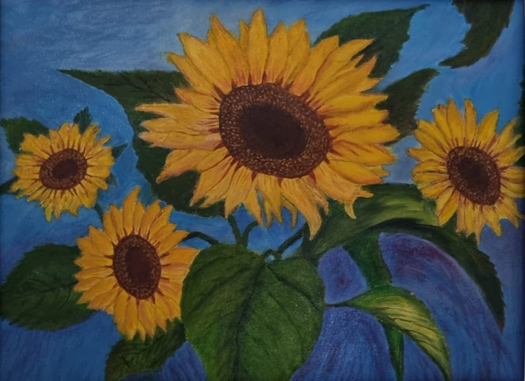 One of my mam’s incredible paintings, ‘The Sunflowers’ which greeted me in Connie’s beautiful home in Kenmare. I was on my way to a ‘Dark Skies Event in Skelligs on Thursday 27th. march and popped in to say hello. How happy was I to gaze on one of mam’s lovely paintings.